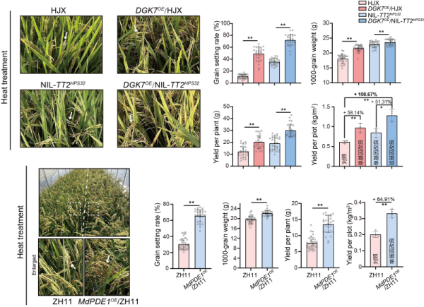 研究团队经过多年努力,成功鉴定到水稻中两个关键调控因子,DGK7(二酰甘油激酶)和MdPDE1(磷酸二酯酶)。它们像一套精密协作的“警报系统”,将高温物理信号一步步转化为细胞能够理解的“生物指令”,完成一场从细胞边界到细胞核的“传讯”。该发现系统连接了从细胞膜脂质重塑到核内信号级联的完整过程,解决了领域内长期存在的难题。