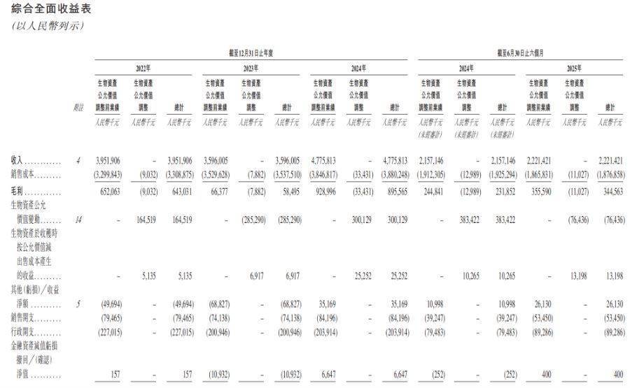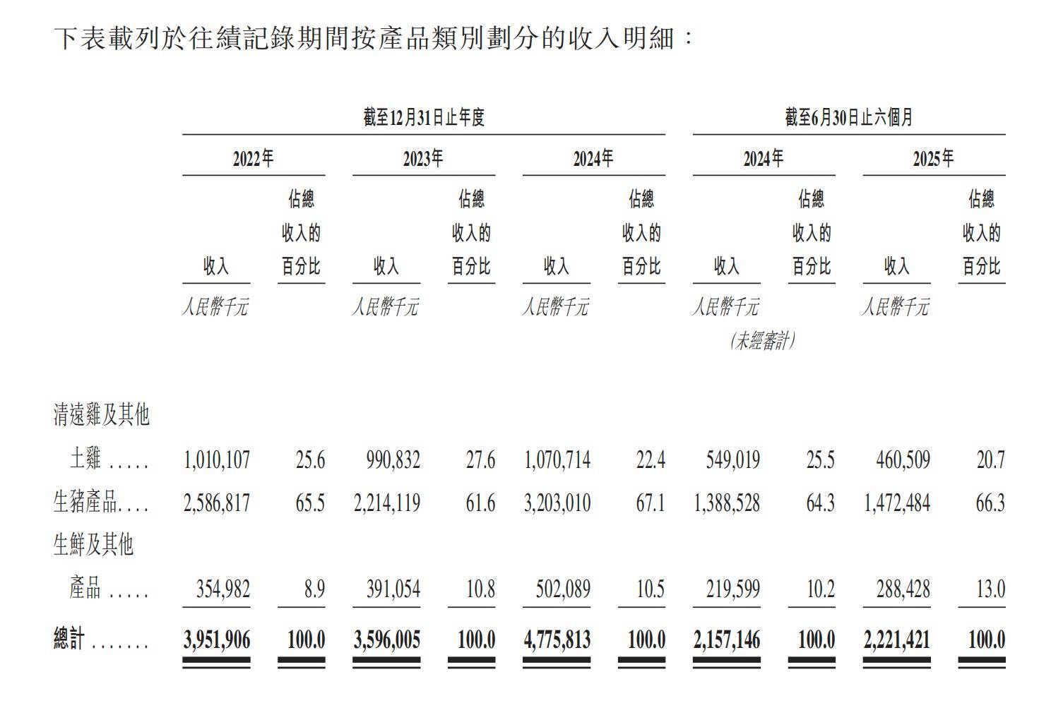 首先是调大了生鲜占比,向产业链下游高附加值环节延伸。数据显示,生鲜及其他产品收入占比从2022年的8.9%提升至2025年上半年的13.0%,有效对冲了市场价格周期性波动。