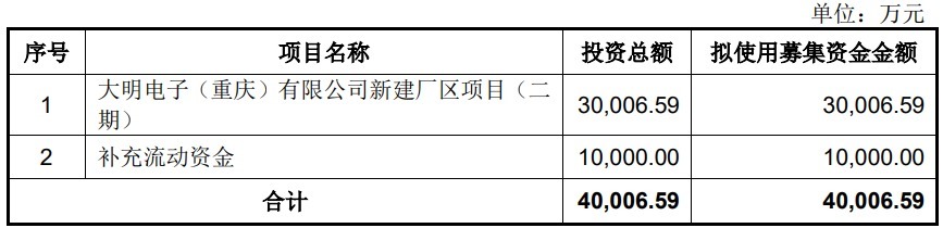 大明电子本次发行募集资金总额50,201.26万元,扣除发行费用后募集资金净额为42,382.20万元,比原计划多2,375.61万元。大明电子2025年10月30日披露的招股书显示,公司拟募集资金40,006.59万元,用于大明电子(重庆)有限公司新建厂区项目(二期)项目、补充流动资金项目。