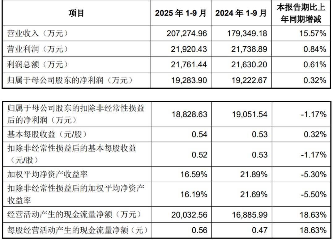 2025年1-9月,大明电子实现营业收入207,274.96万元,同比增长15.57%;归属于母公司股东的净利润为19,283.90万元,同比增长0.32%;归属于母公司股东的扣除非经常性损益后的净利润18,828.63万元,同比下降1.17%;经营活动产生的现金流量净额为20,032.56万元,同比增长18.63%。